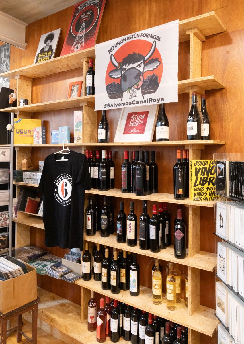 Liburu-denda sarreran dituzte Nafarroako ardo ekologikoak salgai. Horiek zerbitzatzen dituzten tabernan ere. (Argazkia: Dani Blanco / ARGIA CC BY-SA)