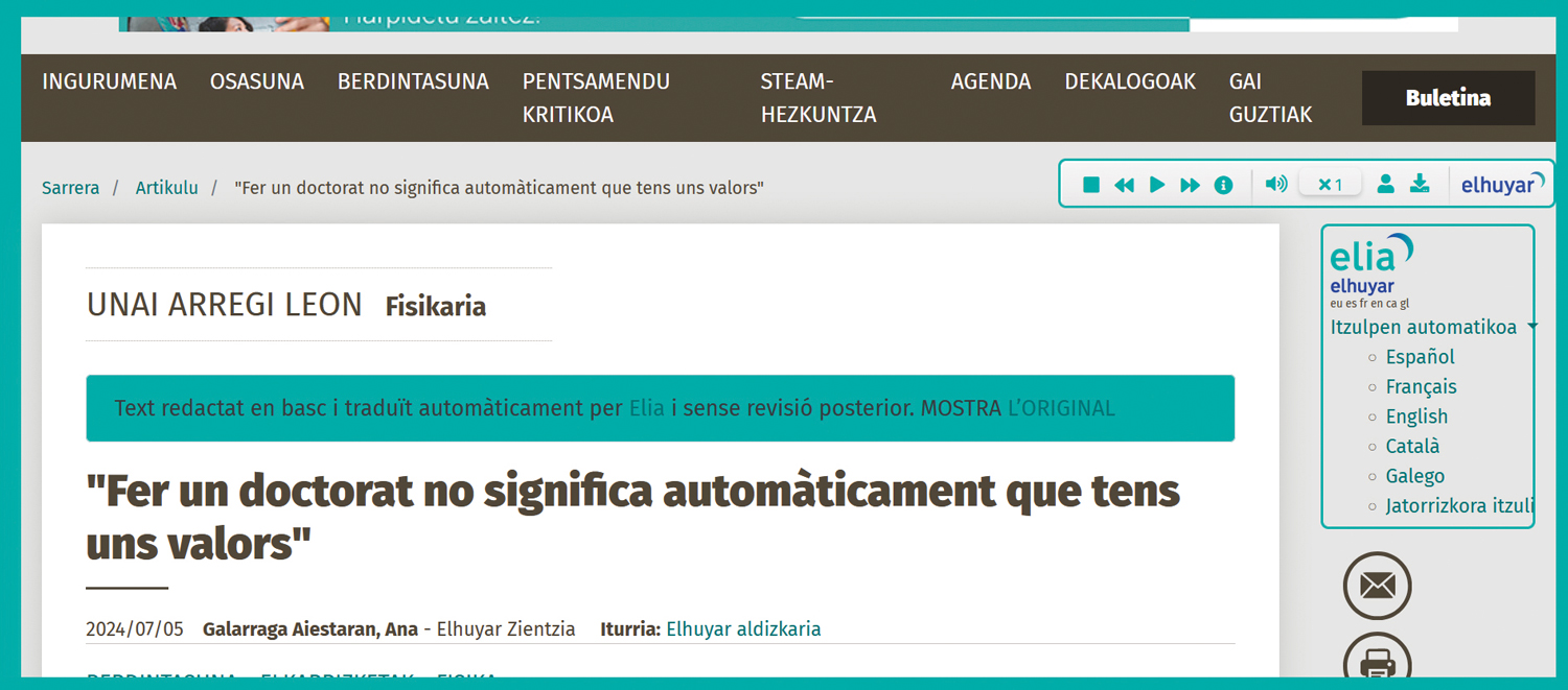 Adibidez, zientzia.eus atarian itzultzaile automatikoa integratuta daukate. Horrek esan nahi du pertsona batek Interneten jartzen badu Como xurdiu o sistema solar? –Nola sortu zen eguzki-sistema? galegoz–, zientzia.eus atarira iritsi daitekeela. Webgunean, albo batean, beste hizkuntzetan ere irakurtzeko aukera eskaintzen du, baita jatorriko bertsioa ikusteko ere. “Argi dugu irakurleak jakin behar duela itzultzaile automatikoak egindako testu bat dela, eta ez benetan pertsona batek egindakoa”, esan du Cortesek.