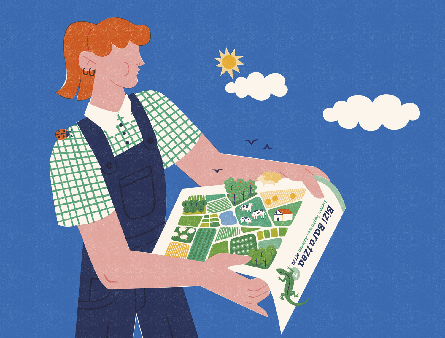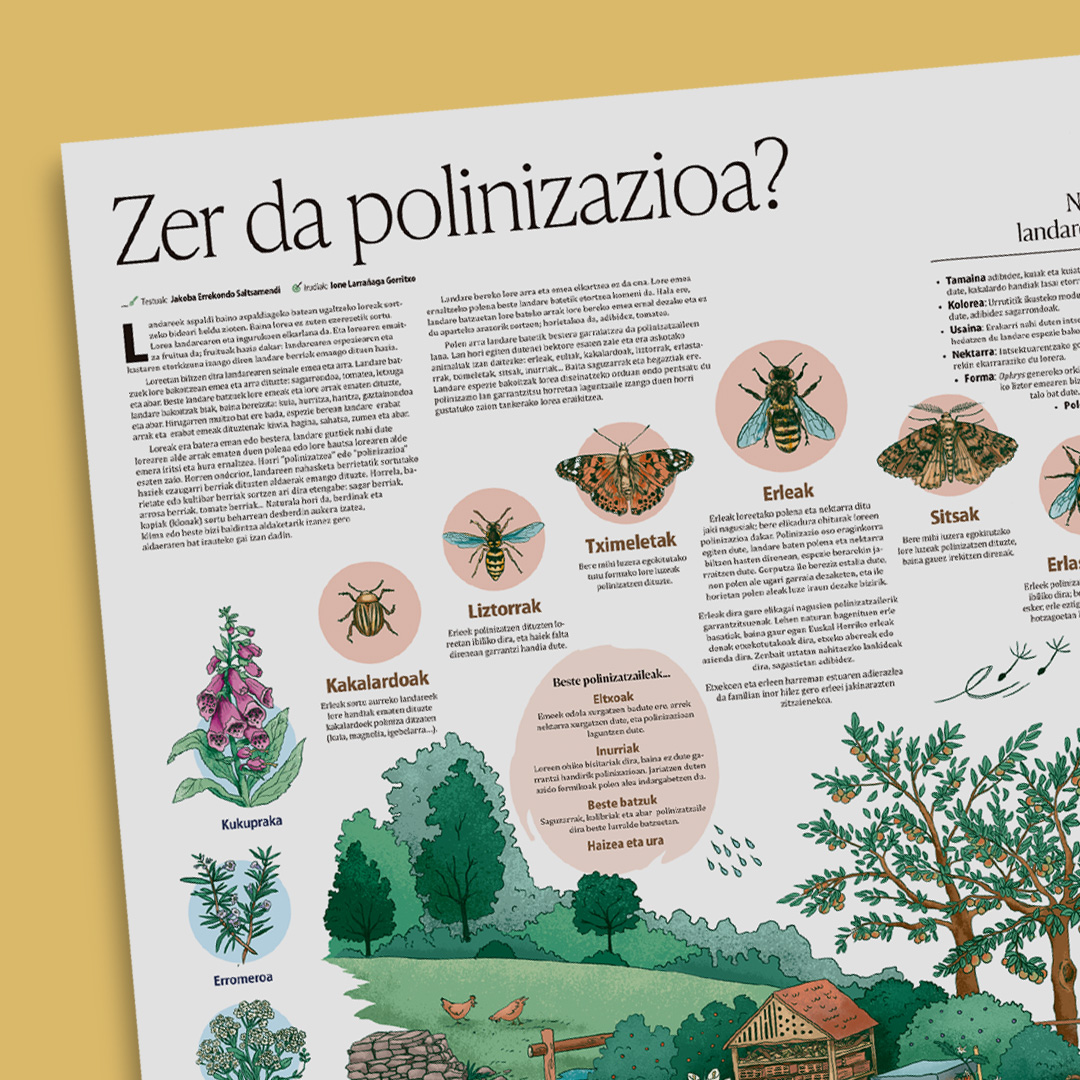 Aldizkariak bere barruan poster handi bat izango dugu urtaro bakoitzean –esan eta esan ari gatzaizkizu, formatu berezia duela...–. Lehen aldizkari honetan polinizazioa da posterraren gaia: Jakoba Errekondok azaldu du testuetan zehatz-mehatz eta Ione Larrañagak xehetasun maila berean egin du ilustrazioa.