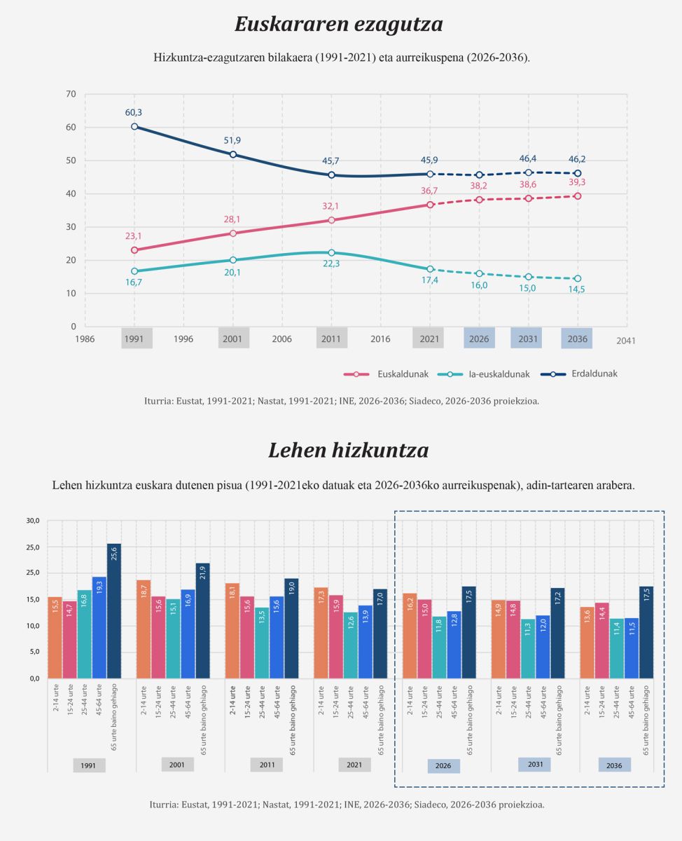 Herritarren lehen hizkuntzan arreta jarrita, goranzko joerari eutsiko dio euskara eta gaztelania biak lehen hizkuntza gisa jasoko duten haurren pisuak, eta are hazkunde azkarragoa izango du euskara eta gaztelania ez diren beste hizkuntza batzuk jaso dituztenen pisuak, batez ere 25 eta 64 urtekoen artean. Azpimarratzekoa da soilik euskara jasotzen dutenen pisuak puntu bat egingo duela behera, bereziki 2 eta 24 urtekoen artean.