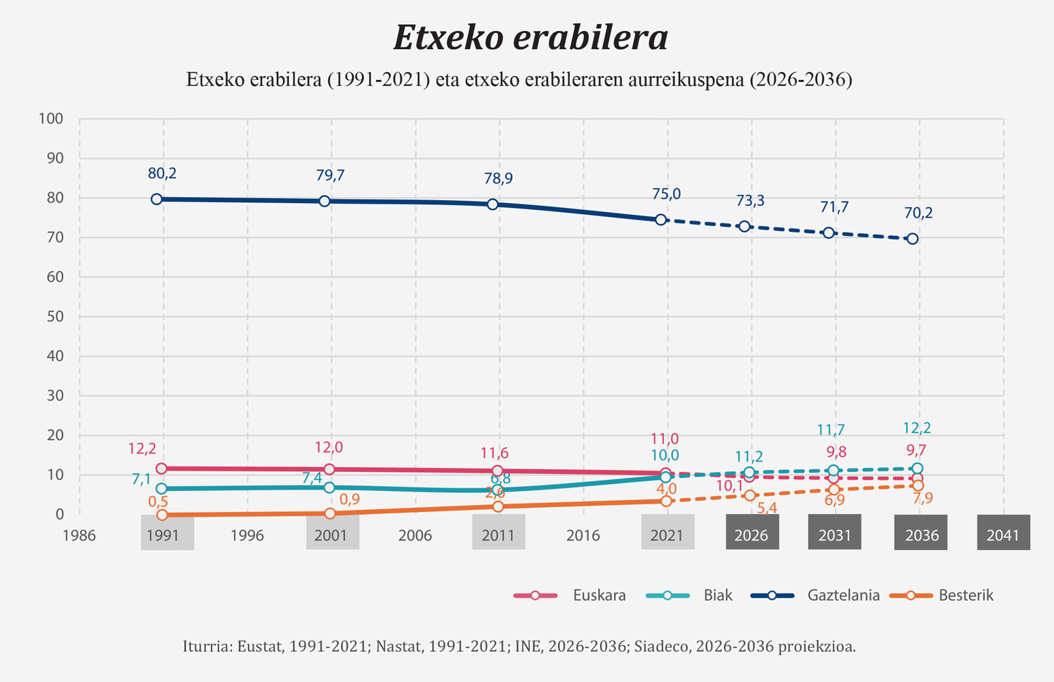 Lehen hizkuntza euskara dutenen pisuak soilik udalerri erdaldunetan hartuko du goranzko joera, gainerako nagusitasun-eremuetan behera egingo du, gaztelaniaren mesedetan. Antzera gertatuko da etxean nagusiki euskara erabiltzen dutenen pisuarekin: gora egingo du udalerri erdaldunetan 2026rako, baina ondoren beheranzko joera hartuko du, gainerako nagusitasun-eremuen antzera.