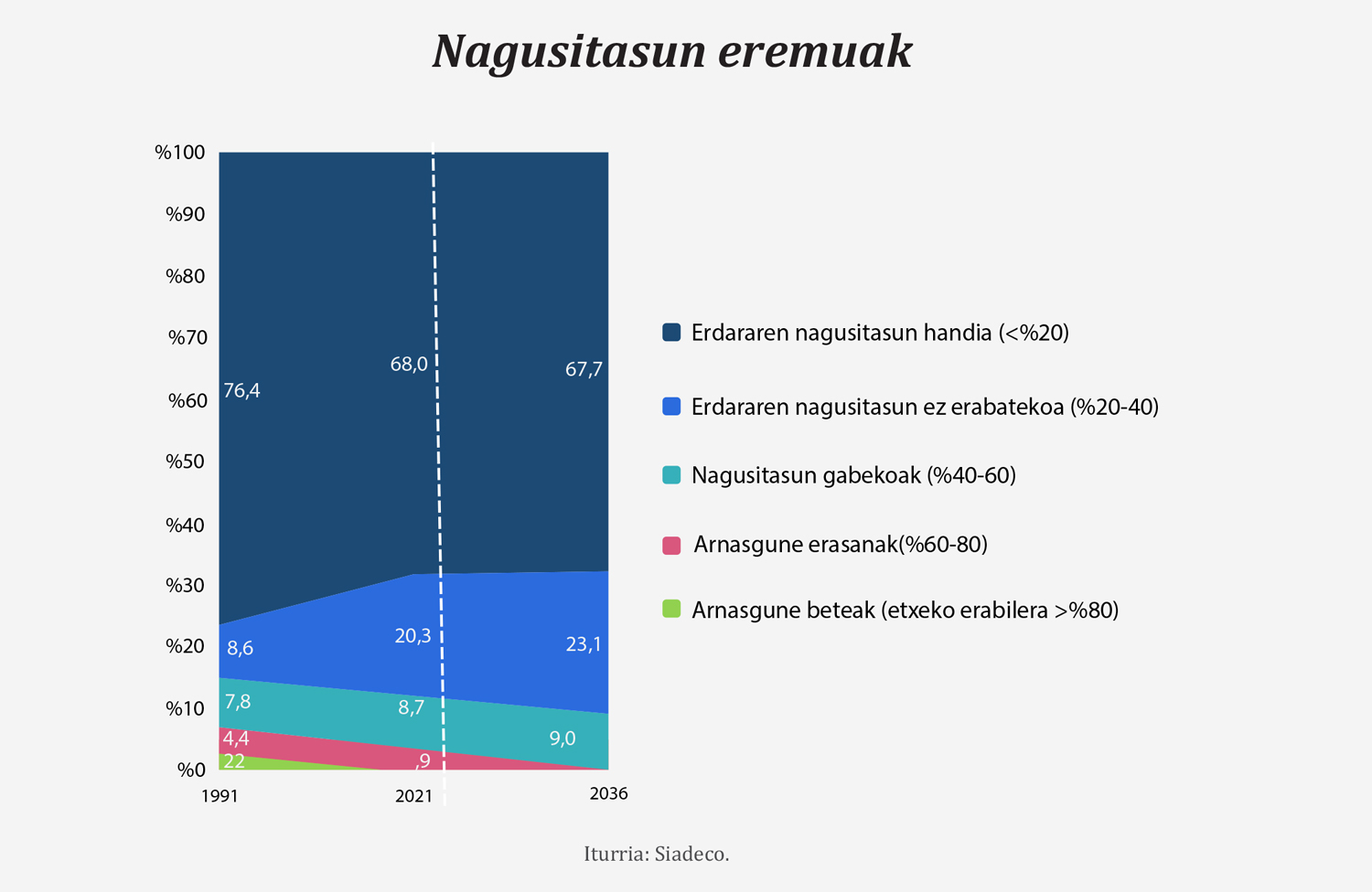 Azterlanak 2036. urtean Hego Euskal Herriko udalerriak nagusitasun-eremuen arabera nola banatuko diren ere irudikatu du. Bost nagusitasun-eremu banatu dituzte etxeko erabilera indizearen arabera, txikienetik handienera: lehenengoan etxeko erabilera %20tik beherakoa da, bigarrenean %20 eta %39,9 bitartekoa, hirugarrenean %40 eta %59,9 artekoa, laugarrenean %60 eta %79,9 bitartekoa eta bosgarrenean, azkenekoan, etxeko erabilera %80tik gorakoa da.