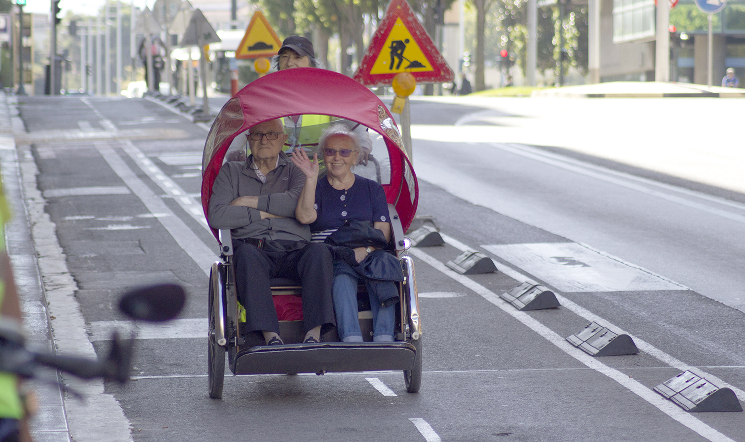 Goizeko hamarrak inguru dira, eguna eguzkitsu dago eta haizea fresko. DomusVi zahar-etxeko atarian Alejo Martinez de Lizarrondo eta Itziar Espinal daude. Txaleko islatzailea daramate soinean eta bizikleta eta trizikloa esku artean. Bizikletan Adinik Ez Iruña elkarteko boluntarioak dira eta 2023tik aurrean eserleku bat duen triziklo baten bidez paseoak egiten dituzte Iruñean. Esperoan gauden bitartean, elkarteaz mintzatu da Espinal. Duela urtebete sortu zuten, baina Bizikletan Adinik Ez egitasmoa nazioartean zabalduta dago. Ole Kassowe-k 2012an Kopenhagen sortutako ekimena da, Cycling Without Age izenez ezaguna. Gaur egun, berrogeita hamar herrialdetan baino gehiagotan dago. Hiru printzipio nagusi ditu: eskuzabaltasuna, istorioak partekatzea eta harreman berriak eraikitzea. “Oso esperientzia polita da, jendea ezagutzen dugu eta istorio pila bat partekatzen ditugu. Aurrekoan batek esan zidan Zitadelan dagoen izar bat bere anaiak egin zuela”, kontatu du Espinalek.