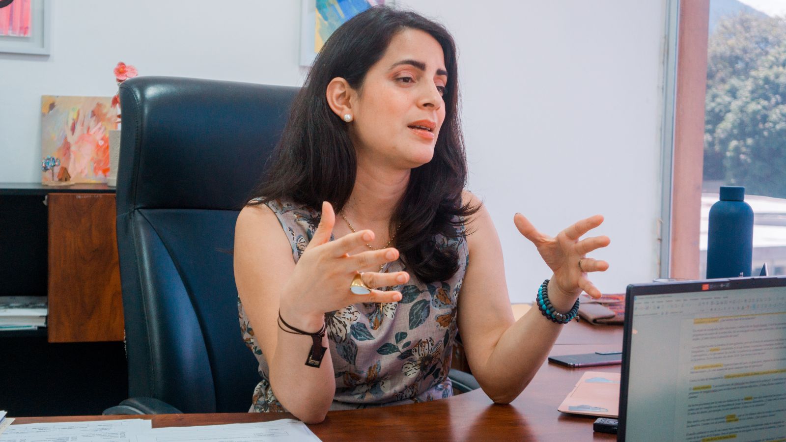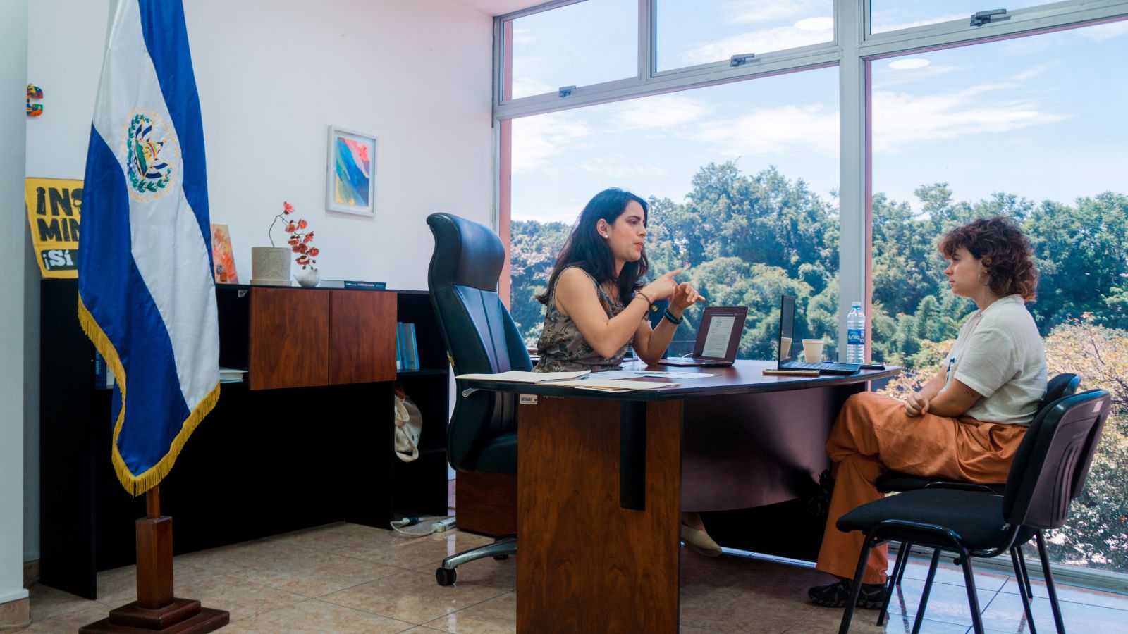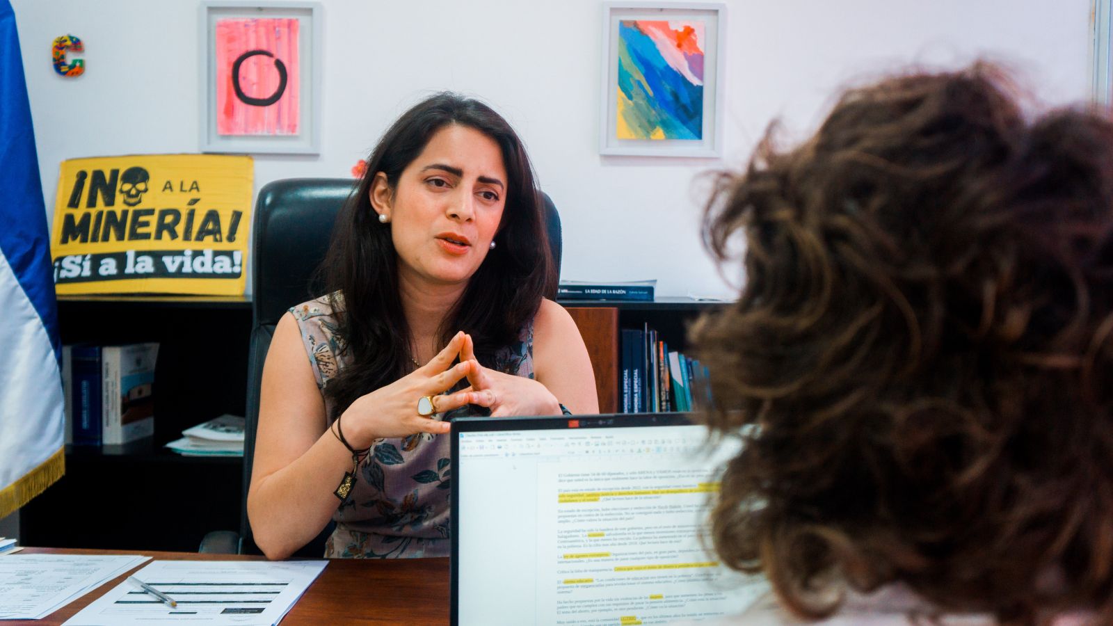 San Salvadorko bihotzean dago Saloi Urdina, El Salvadorko Asanblea Legegilea. Hantxe jarri du hitzordua, uztailaren 29an, Claudia Ortiz Vamos alderdiko diputatuak (San Salvador, 1987). Bigarren legegintzaldia du Saloi Urdinean, eta bietan egokitu zaio oposizioko eserleku apurrak betetzea. Bukelek konstituzioa aldatu aurretik egin du elkarrizketa, ARGIArekin, eta kritiko baina itxaropentsu ageri da. Konstituzio aldaketa eta boterearen betikotzearen ostean izandako hitz trukean, aldiz, ezkor dago Ortiz. Egun horretako plenoko bere irudi batek gurutzatu du mundua: kongresuko bere eserlekuan ageri da Ortiz, “Herriak soilik salba dezake herria” kartela eskuetan.