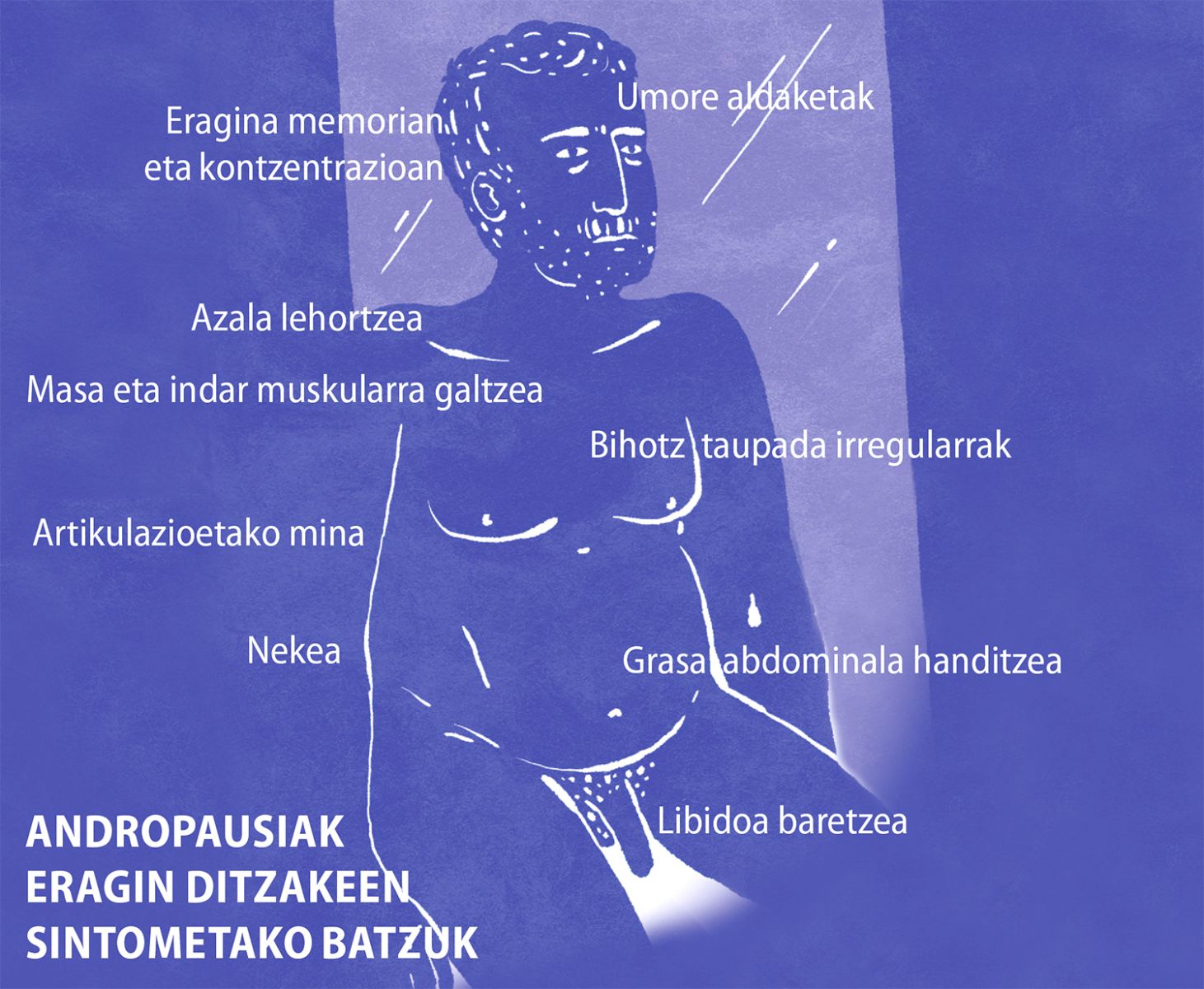 "Libidoa asko baretu zait, erekzioa izatea ere zailagoa da, eta sumatzen ditut ahultasuna, nekea, muskulu galera, txizari eusteko ezintasuna… Izango du loturarik andropausiarekin, nik adinari egotzi izan diot, mugak agertzen doaz eta adin batetik aurrerako prozesua dela pentsatu dut. Horrek ez du esan nahi gaizki bizi ditudan gauzak ez daudenik; sentitzen zara ziurtasun gutxiagorekin, hainbatetan frustratuta… Medikuarenera ez naiz joan, oso gaizki egon behar dut nik medikuarenera joateko, baina espezialisten laguntza eta aholkuak baliagarriak izan daitezke, bai”. Hala adierazi digu Gasteizko Anttonek (izena aldatu diogu). Bere bizipenekin jarraitu aurretik, kokatu dezagun asko eta askorentzat arrotza den gaia.