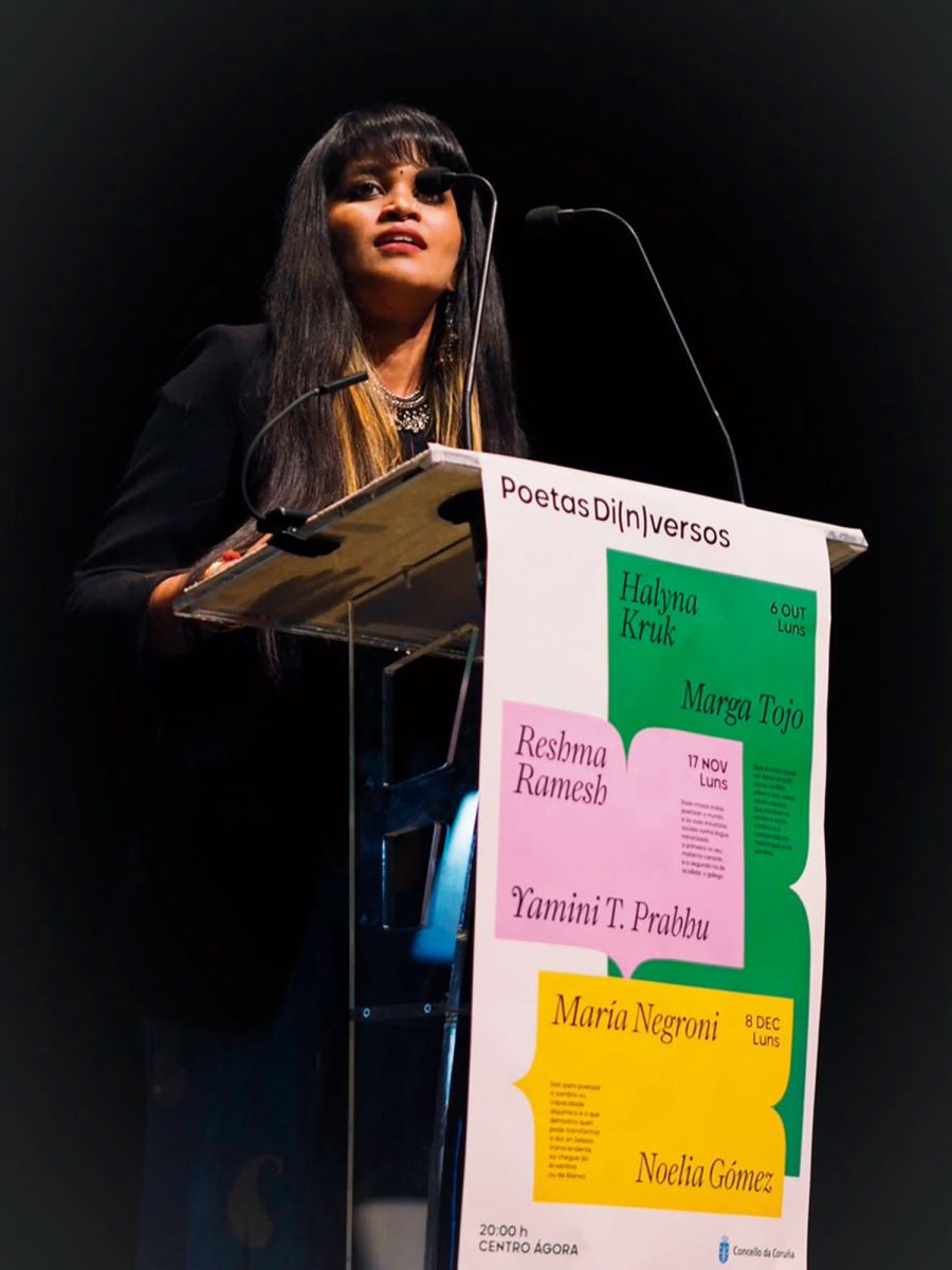 A Coruñako (Galizia) Poetas Di(n)versos jardunaldietan entzun genuen, Reshma Rameshen aldamenean. Bakoitzak ordu erdiko errezitaldi bat eskaini zigun, Reshmak kannadaz eta ingelesez, eta Yaminik bere zazpigarren hizkuntzan, galegoz; hurrengo urtean argitaratzekoa duen poema-bildumaren zati bat izan zen han aditutakoa. Elkarrekin bi otordu egin, eta grabagailua noiz itzali asmatu ezina. Hori da Yamini elkarrizketatzea.