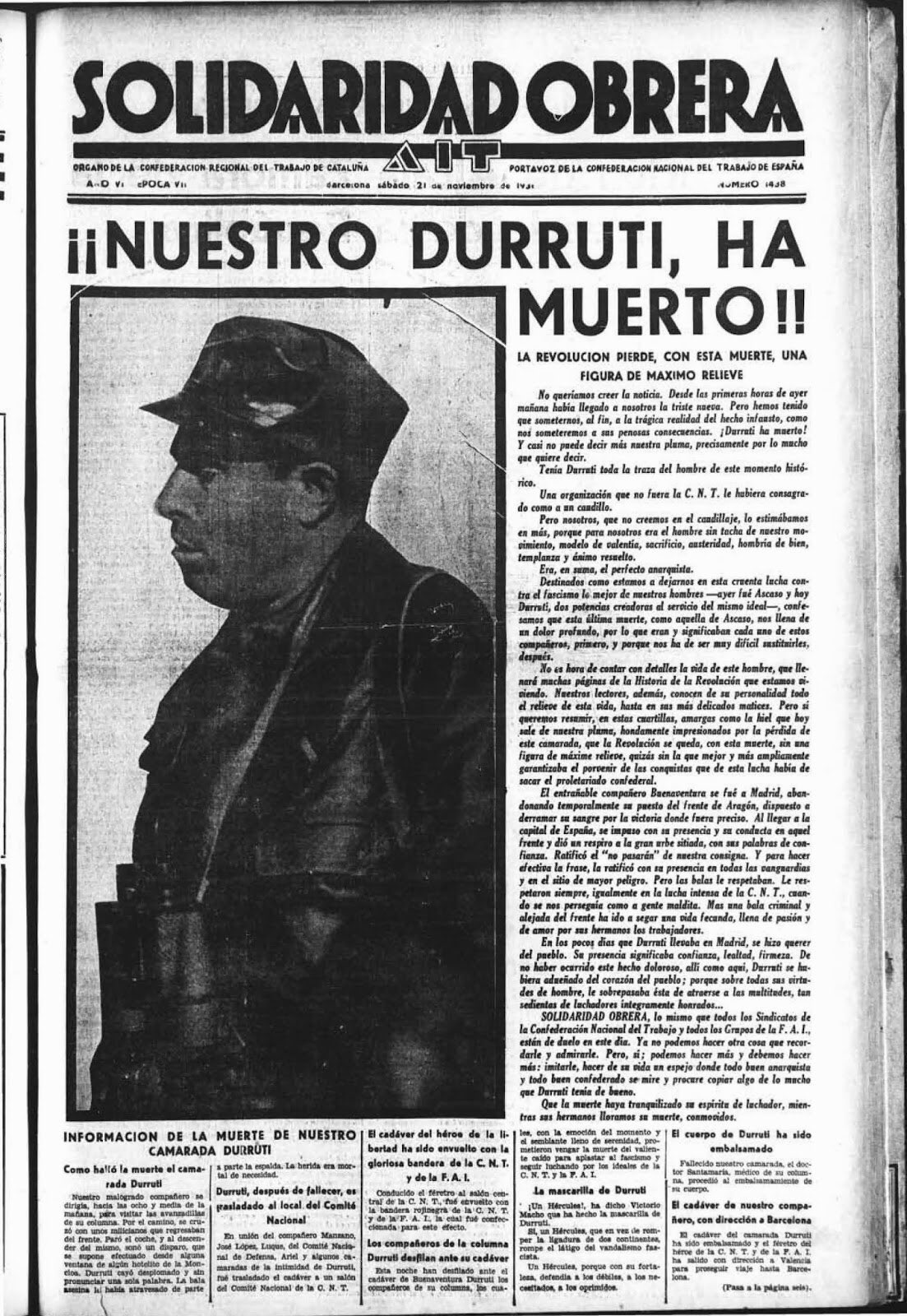 Buenaventura Durruti anarkista hil zen Madrilen. Bezperan hiriaren defentsan jasotako tiro batek larri zauritu zuen. Kataluniako eta Espainiako Estatuko anarkismoaren figura karismatikoenetakoa izan zen. 36ko Gerraren hasieran Zaragoza askatzera abiatu zen Durruti zutabearen burua izan zen, besteren artean.