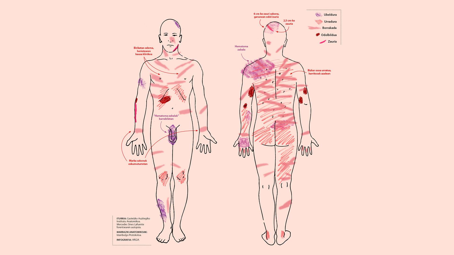 1993ko abuztuaren 20an, goizaldeko 5:00ak aldera, Santiago Ospitaleko larrialdietako osasun langileen talde bat Juan Calvo biziberritzen saiatu zen, alferrik: Arkauteko komisariatik hilotz irten zen bilbotarra. Juan Calvoren gorpuari Mercedes Sines Lafuente mediku forentseak egindako autopsiaren zenbait pasarte bildu ditugu bideo honetan; eta audioan oinarrituta osatu du ARGIAk bideoko golpeen infografia.