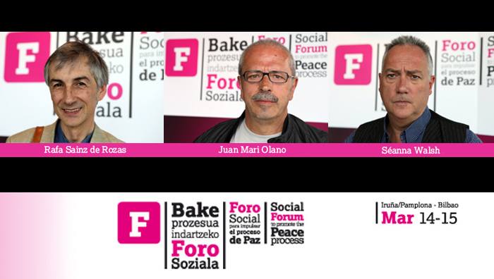 Seanna Walsh, Juan Mari Olano eta Rafa Sainz de Rozasen hitzaldia Euskal Herriko bake prozesua indartzeko Foro Sozialean.