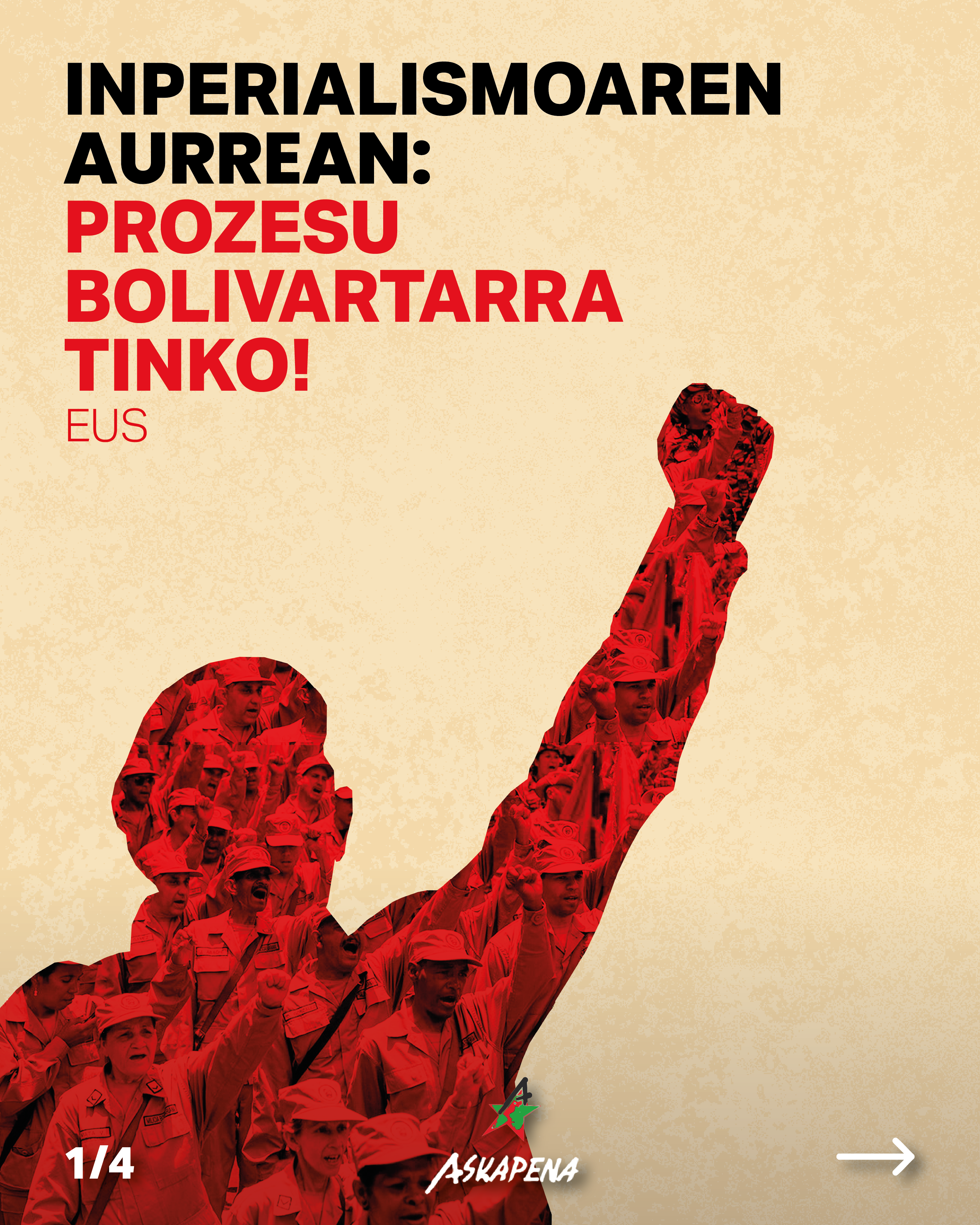 Euskal Herritik ere gure elkartasun osoa helarazi nahi diogu herri ausart horri, ¡Comuna o nada! aldarrikatzen duen herriari. Baina euskal internazionalistok, ezinbestez, elkartasun mezu horri gehitu behar diogu inperialismo yankiari estaldura ematen dietenen salaketa. Inposatu diguten Europar Batasuna gerrazalea prozesu bolivartarraren etsai amorratua da eta inperialismo yankiarekin lerrokatzen da, Etxe zurian dagoen presidenteaz harago. Era berean, salatu behar ditugu Euskal Herrian bertan Venezuelako prozesua desitxuratzen duten alderdi, hedabide eta eragileak. Beren mezu pozoitsuaren bidez prozesu bolivatarraren aurrerapenak ezkutatzen saiatzen dira, baita herri venezuelarri inposatutako setio-egoerak sortutako ondorioak testuingurutik atera eta handiesten saiatu ere, deskonposizioan eta autoritarismoan itotako Estatu baten irudia zabaldu nahian. Venezuelaren aurkako erasoak eta esku-hartze militarra justifikatzen dute hemengo burgesiak eta bere lekaioek, nahiz eta giza eskubideen aldeko mezu humanitaristekin mozorrotzen saiatu. Era beran, bi mendez herriak odolusten jarraitzen duten AEBak demokrazia eta askatasunaren eredutzat aurkezten dizkigute, Trumpez harago. Bakezalekeria abstraktuaz betetzen dute ahoa casus bellia eraikitzen ari diren bitartean.