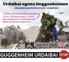 Urdaibai eguna Guggenheimen Maiatzak 18 Domeka. `Museoen eguna` : Txoriz beteko dugu Guggenheim Bilbao Museoaren aurrekaldea, *Urdaibai da gure museoa*, eta erakutsi nahi dugu. Naturaz blai jarriko dugu Bilbo, *txori mezulariak* izango gara, eta gure mezua: *Guggenheim Urdaibai Stop!*