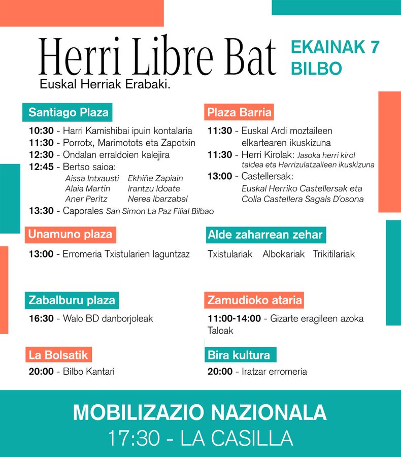 Mobilizazio nazionala arratsaldean izango bada ere, Gure Eskuk egun osoko egitaraua prestatu du, goizetik gaueraino. Bertsolariak, musika, pailazoak, erraldoiak, txistulariak eta trikitilariak, herri kirolak eta abar izango dira Bilboko hainbat gunetan. Halaber, martxaren bukaeran Sol Band Palestinako taldea ariko da Bilboko udaletxe ondoko oholtzan.