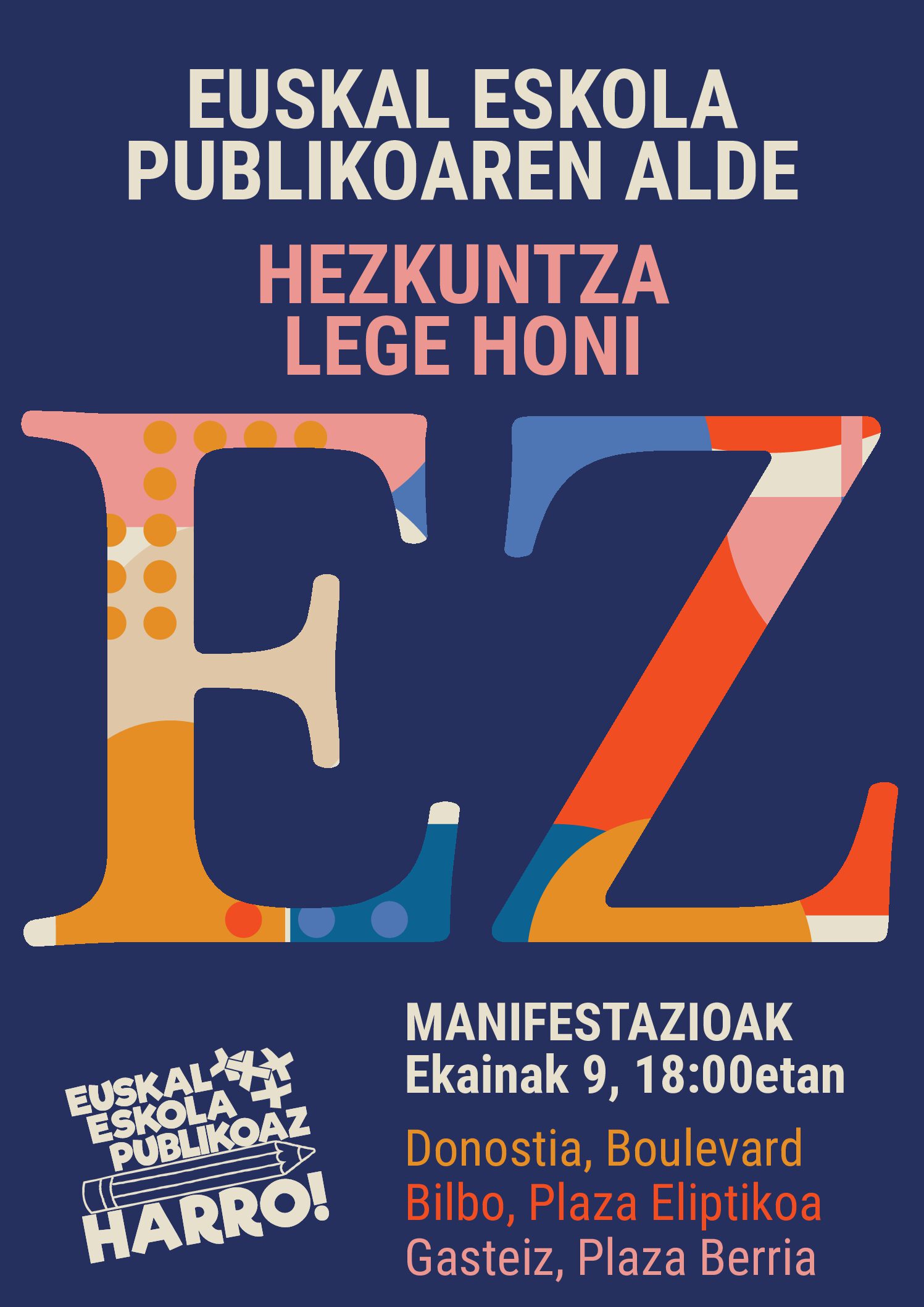 Euskal hezkuntza publikoa bultzatzen duen plataforma. Denona eta denontzat. Euskalduna, feminista, laikoa, era demokratikoa - Nahi dugun eskola sare publikoa indartuz eta zabalduz, eta publifikazio prozesuak bideratuz baino ez dugu lortuko. Apustu sendoa egiten dugu herritar guztiontzako hezkuntza inklusiboaren alde, hau da, eskola publikoa guztiontzat izan dadila. Halaber, gure ustez hezkuntza publikoa kohesio sozialaren funtsezko elementua da eta beharrezkoa da lan egitea pertsona guztien inklusioaren aide gizarte honetan.