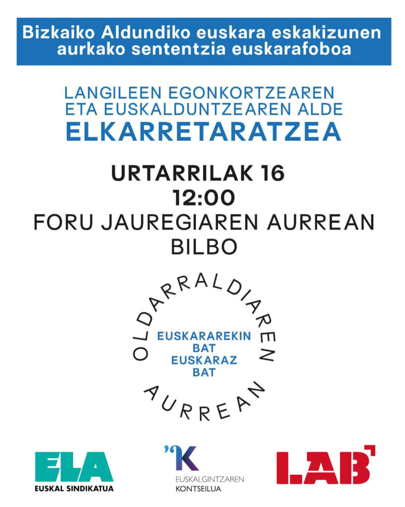 Honen aurrean, Euskalgintzaren Kontseiluak eta langileen ordezkaritzaren gehiengoa duten LAB eta ELA sindikatuek langileen eta euskararen aldeko ELKARRETARATZEA deitu dute ostegun honetarako, urtarrilak 16, 12:00etan Bizkaiko Foru Jauregiaren aurrean (Kale nagusia 25, Bilbo – Kokapena).