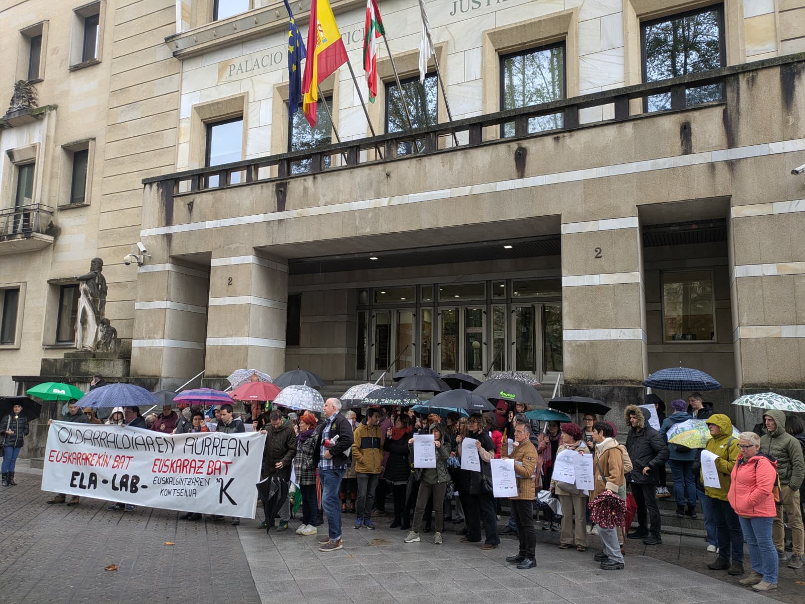Gaur, Euskalgintzaren Kontseiluak, ELAk eta LABek elkarretaratze bikoitza egin dugu Bilbon (Justizia Jauregiaren aurrean) eta Donostian (Gipuzkoako Diputazioan) euskaraz lan egiteko eskubidearen alde eta auzitegien oldarraldi euskarafoboaren aurka.