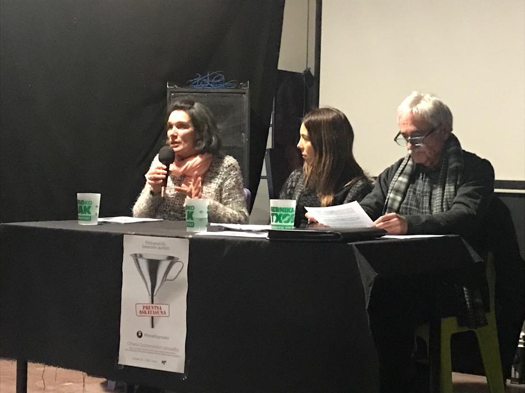 100 lagun inguru elkartu gara gaur ASTRA Gernikan, Ipes elkarteak antolatu dugun “pentsamendu bakarraren aurrean, prentsa askatasuna”solasaldian.Bertan Oihana Goiriena , Oihana Cabello (aurkezlea) eta Ramon Zallo izan dira hizlari, eta Pablo Gonzalezen kasua izan dugu ardatz.
