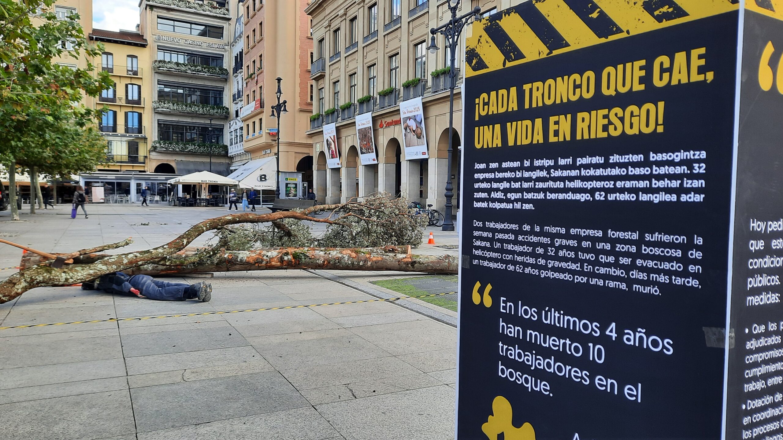Iruñeko Gazteluko plazan egindako mobilizazio sindikal ikusgarri batean LAB, ESK, Steilas, EHNE-Etxalde, Hiru eta CGT-LKN sindikatuek salatu dute 30 urteren ondoren enpresek ez dutela lan osasuneko araudia betetzen.¡Cada tronco que cae una vida en riesgo! Enpresen arau-hausteak azpian harrapatzen gaitu! Lelopean, joan den asteko azken lan istripu hilgarria Iruñeko erdigunean birsortzearekin batera (langile bat hilda […]