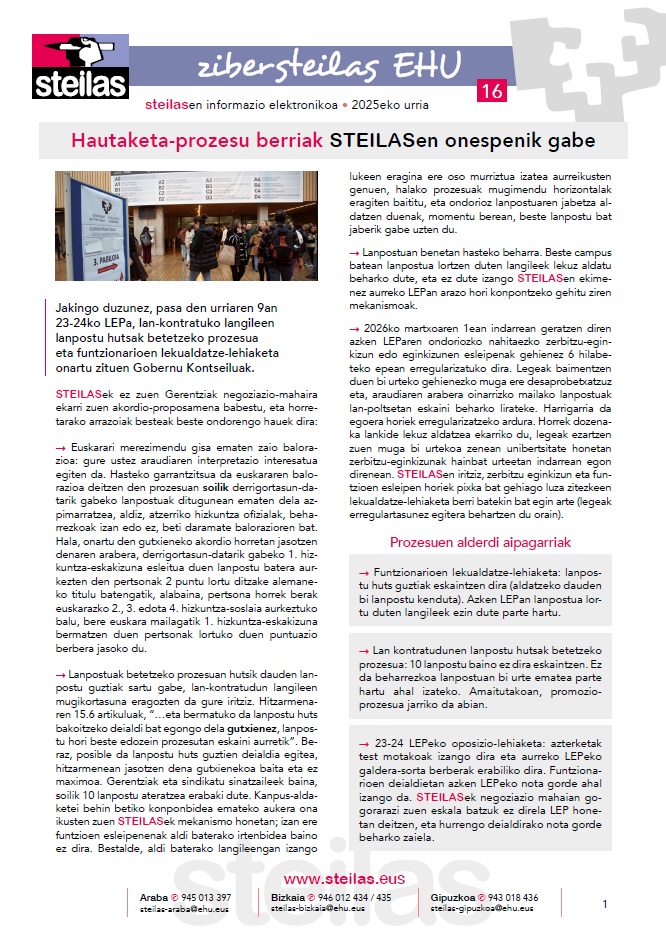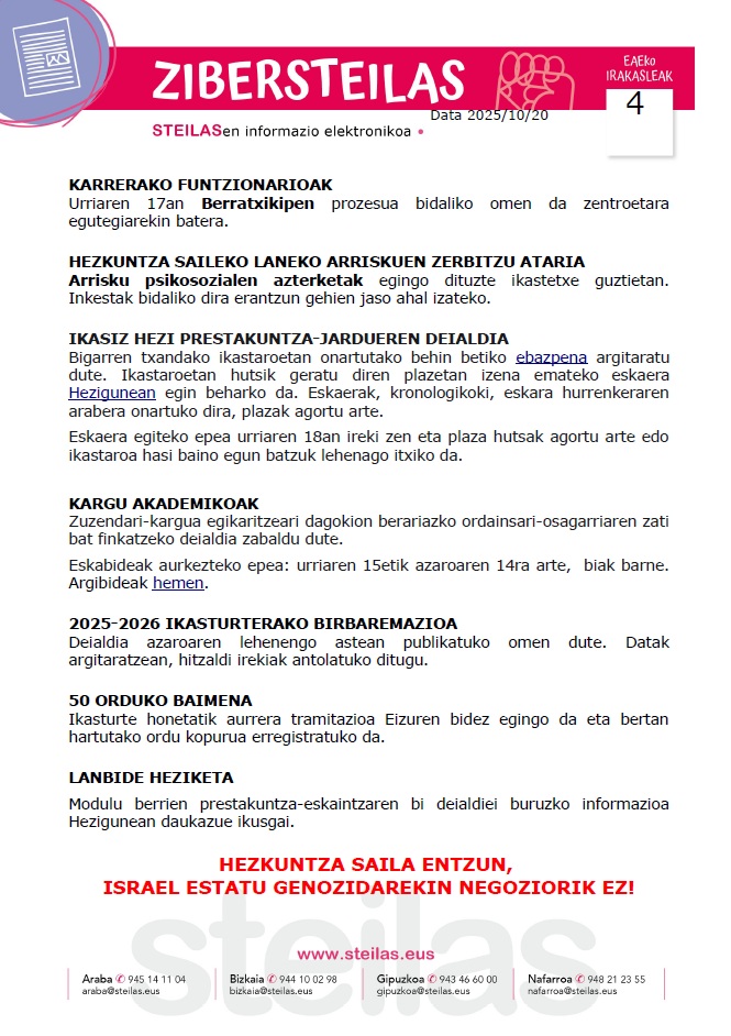 Zibersteilas 4: berratxikipena, laneko arriskuen zerbitzu ataria, ikasiz hezi, kargu akademikoak, birbaremazioa, 50 orduko baimena eta lanbide heziketa