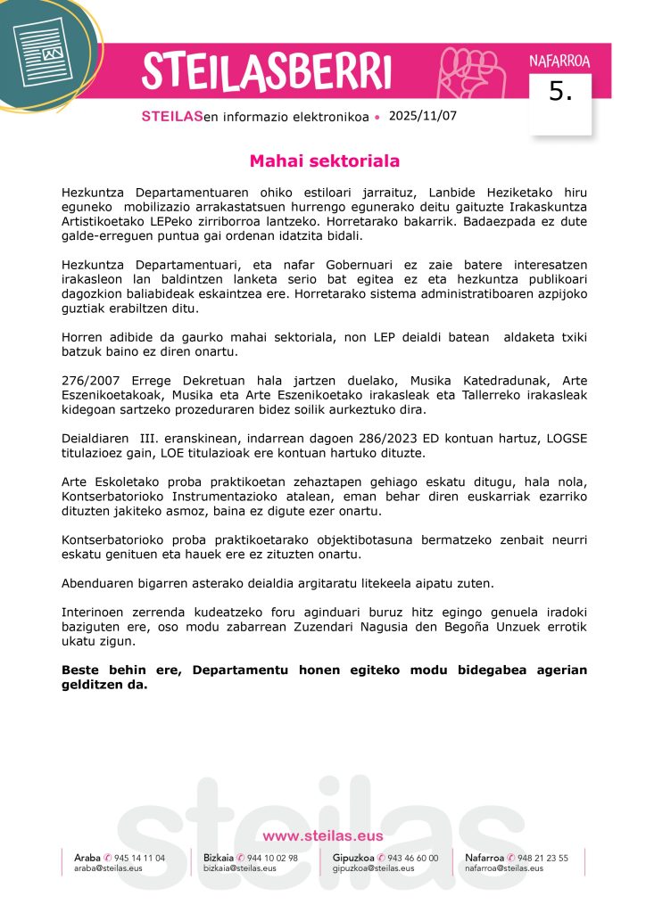 Akordio berriko hainbat eduki adostutako baldintzetan ezartzeko eskatu diogu Hezkuntza Sailari